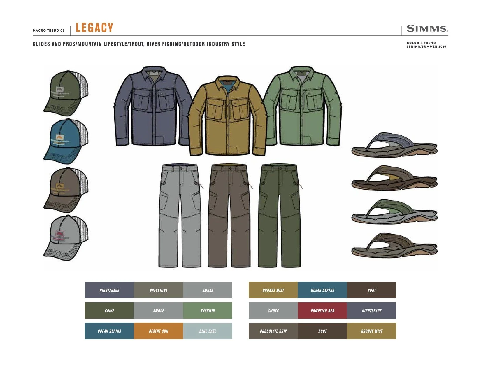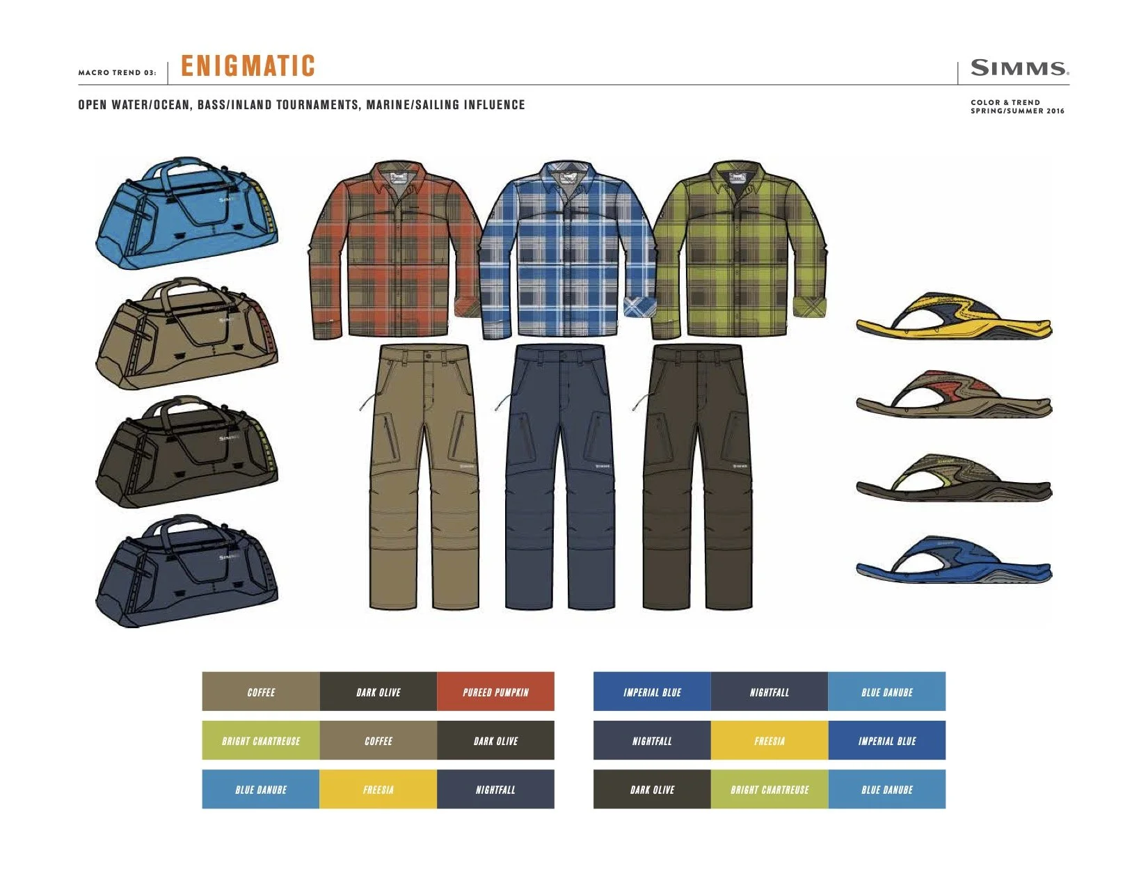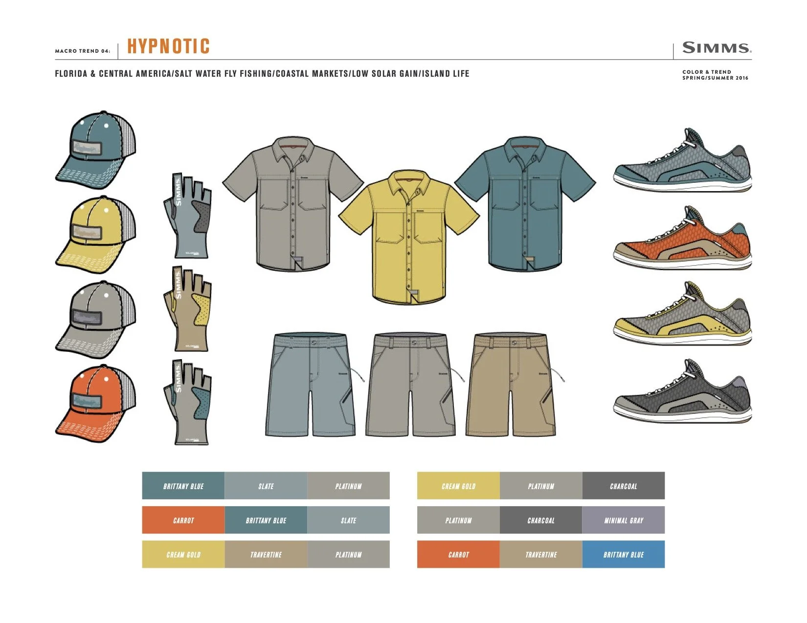 Simms is a leading brand in performance fishing gear, known for its technical innovation, rugged durability, and deep connection to the angling community. I developed seasonal color forecasts across apparel, footwear, and equipment categories, tailoring palettes to the unique needs of each product silo and consumer segment. Recognizing the importance of strategic color merchandising, I aligned seasonal direction with product function, regional relevance, and user mindset, helping to create cohesive, consumer-focused assortments across the line.