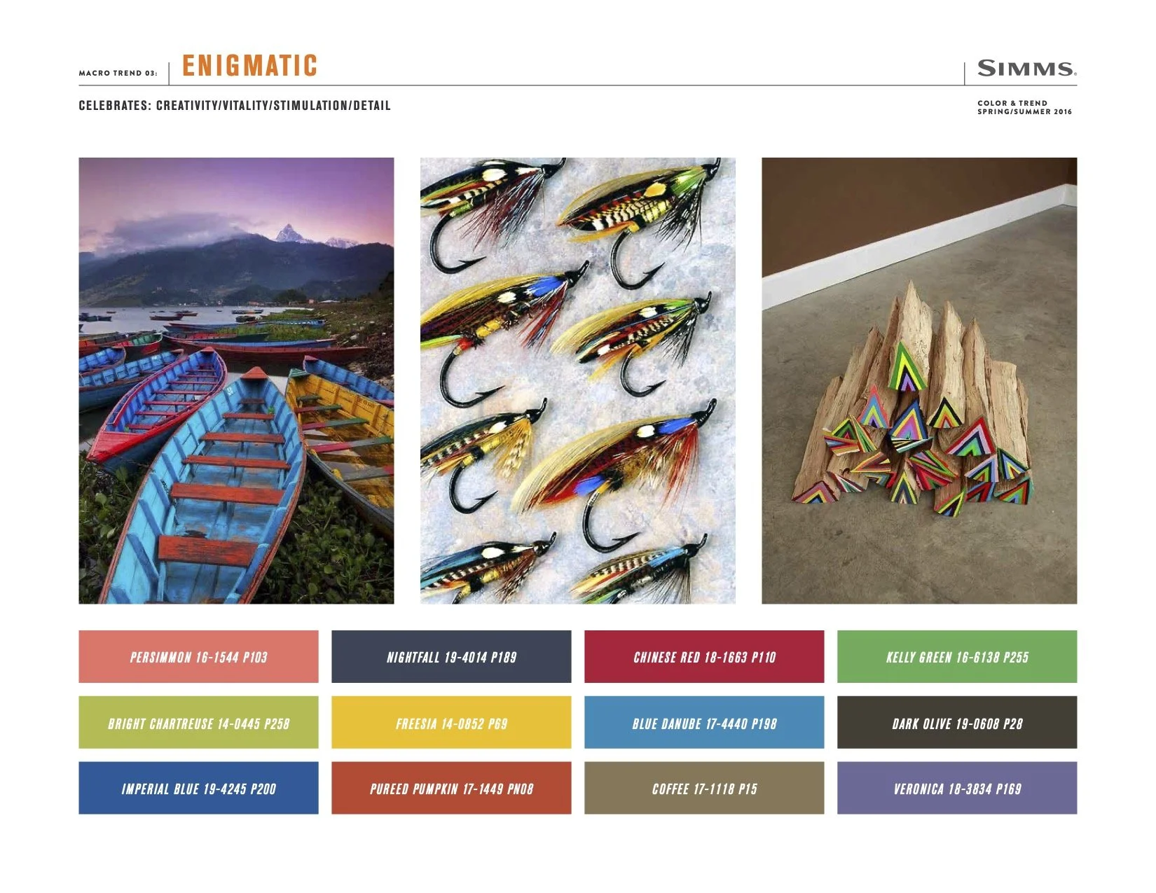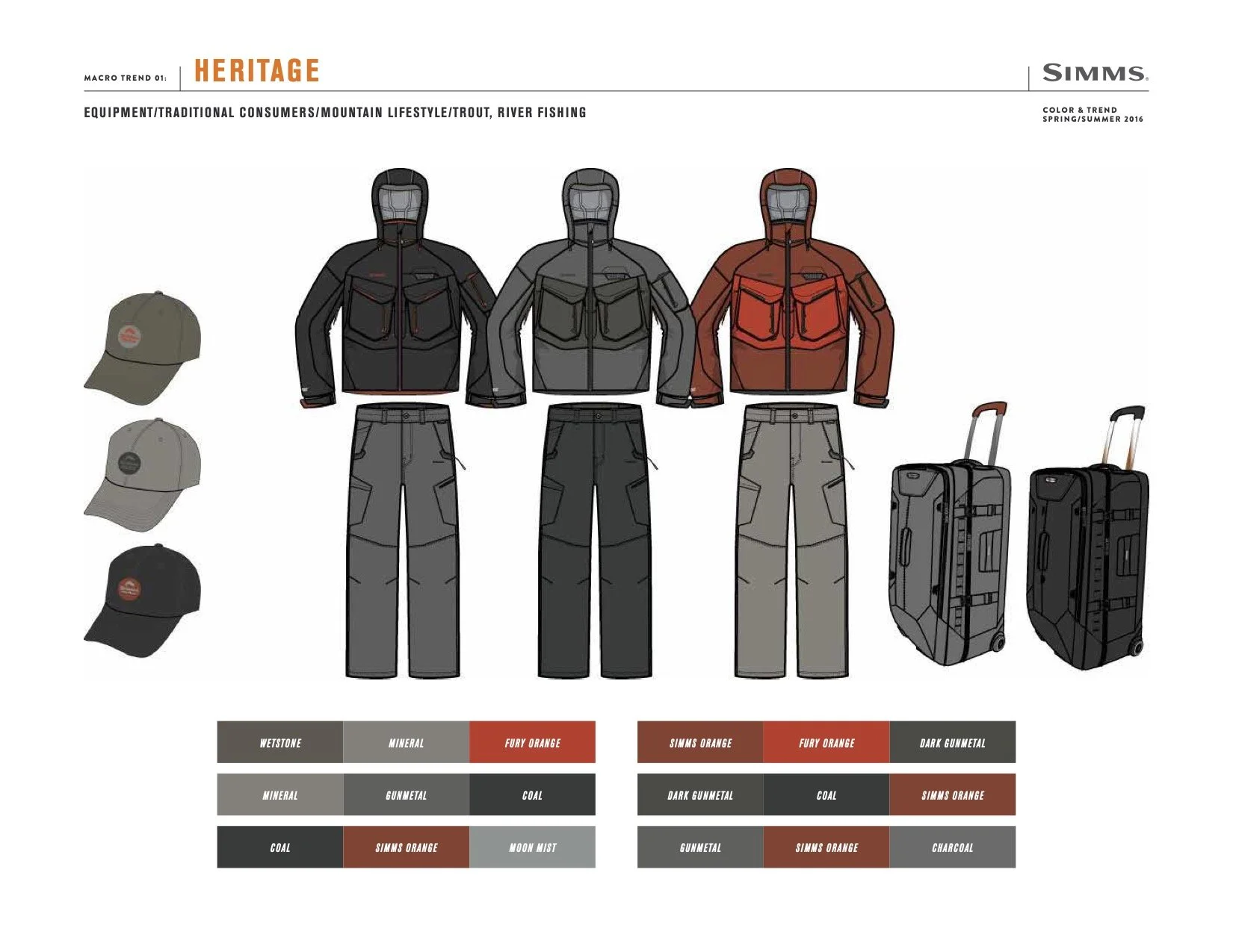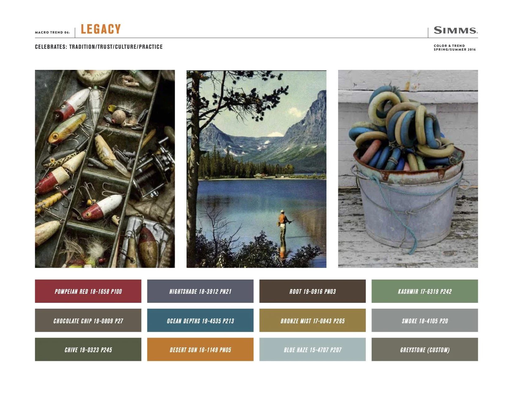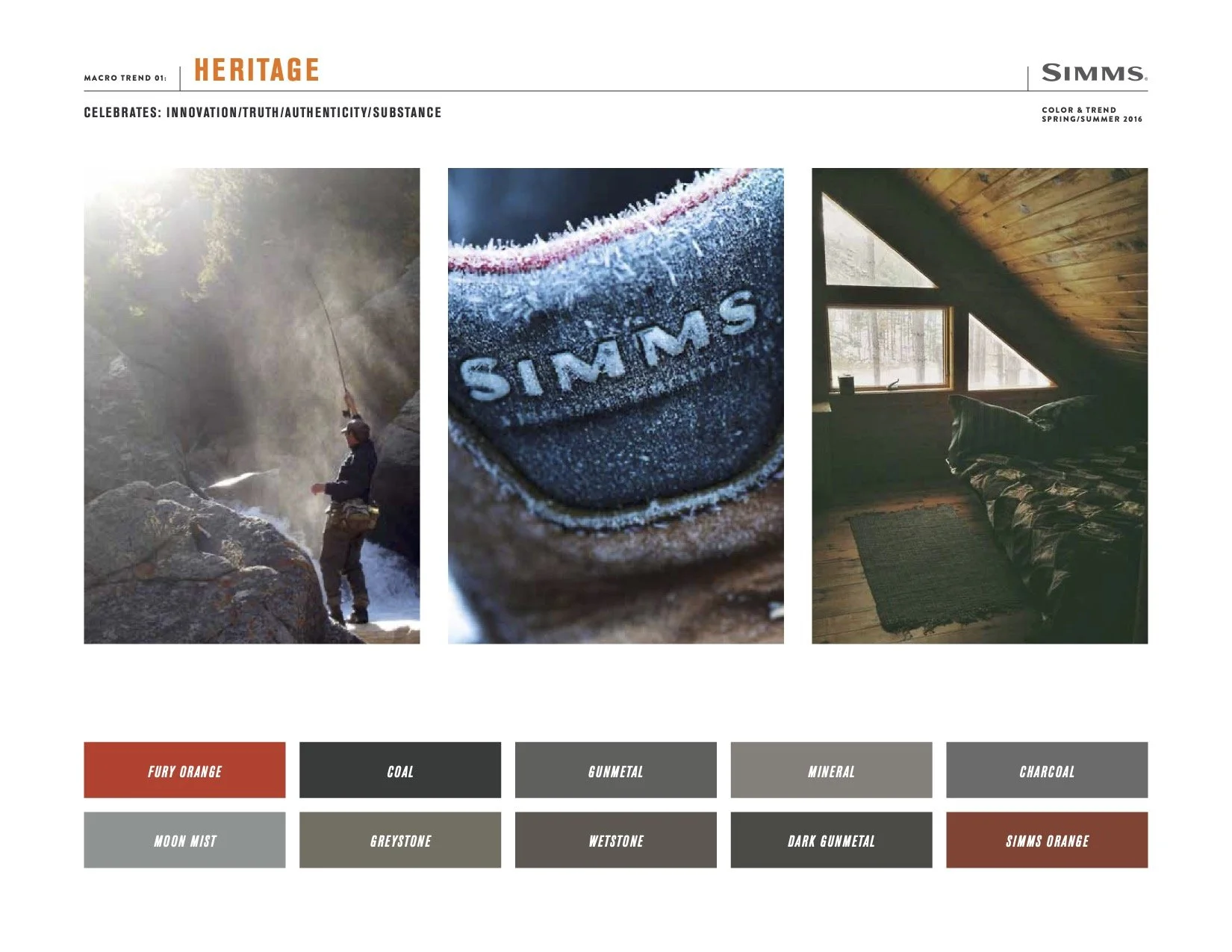 Simms is a leading brand in performance fishing gear, known for its technical innovation, rugged durability, and deep connection to the angling community. I developed seasonal color forecasts across apparel, footwear, and equipment categories, tailoring palettes to the unique needs of each product silo and consumer segment. Recognizing the importance of strategic color merchandising, I aligned seasonal direction with product function, regional relevance, and user mindset, helping to create cohesive, consumer-focused assortments across the line.